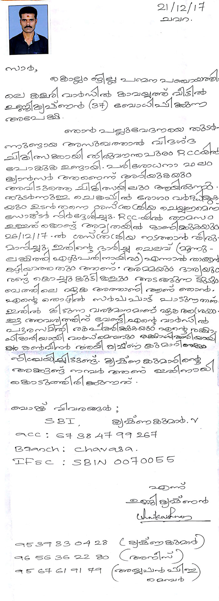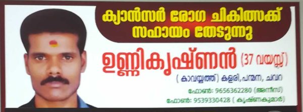 അമ്മയും ഭാര്യയും രണ്ടു കൊച്ചു കുട്ടികളുമുള്ള ഈ കുടുംബത്തിന്റെ ഏക ആശ്രയമായ 37 വയസ്സ് മാത്രമുള്ള ഈ ചെറുപ്പക്കാരൻ, ക്ഷേത്രങ്ങളിൽ സർപ്പ പാട്ടുപാടി കിട്ടുന്ന ഒരു ചെറിയ വരുമാനം ഉപയോഗിച്ചാണു തന്റെ ഈ കൊച്ചു കുടുംബത്തെ നോക്കിയിരുന്നത്. സന്തോഷമായിരുന്ന ഈ കുടുംബത്തിന്റെ താളം തെറ്റിക്കുന്ന വിധത്തിൽ പെട്ടെന്ന് എത്തിയ ക്യാൻസർ എന്ന് വിളിക്കുന്ന ഈ രോഗത്തിൽ അതിമൂർധന്യമായ അവസ്ഥയിൽ നിന്നും രക്ഷിക്കാൻ ഭാരിച്ച ചിലവായ മൂന്നു ലക്ഷത്തി എഴുപതിനായിരം രൂപ എങ്ങനെ ഒപ്പിക്കുമെന്ന അവസ്ഥയിൽ എത്തിയപ്പോൾ നമ്മുടെ നാട്ടിലെ നല്ലവരായ ചില സുഹൃത്തുകളും നാട്ടുകാരും ചേർന്നു പൗരസമിതി രൂപീകരിക്കുകയും ഓരോ വീട്ടിൽ കയറി ഇറങ്ങിയും വഴിയിൽ നിന്ന് പിരിച്ചും ഏകദേശം ഒന്നര ലക്ഷത്തോളം രൂപ സമാഹരിക്കുകായും ചെയ്തു.